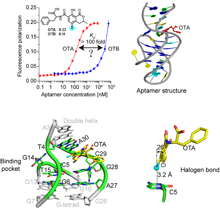 核酸适体是一类能特异性与靶标结合的寡核苷酸片段。核酸适体的靶标范围非常广泛,被誉为化学家的抗体,在生化传感、药物开发等多方面具有潜在应用。赭曲霉毒素A (OTA)是食品、农产品等中的常见污染物,具有强致癌性。OTA的快速灵敏检测与健康、食品安全紧密相关。核酸适体OBA36是高亲和、高特异性识别OTA的DNA核酸适体,能区分一个原子差别的赭曲霉毒素同系物OTA和 OTB(见下图)。该适体不仅是OTA快速灵敏检测的潜在理想工具,也广泛应用于生化传感的开发。然而,由于缺乏高分辨率的结构,十余年来,核酸适体高亲和、高特异性识别的分子机制不断不清楚。