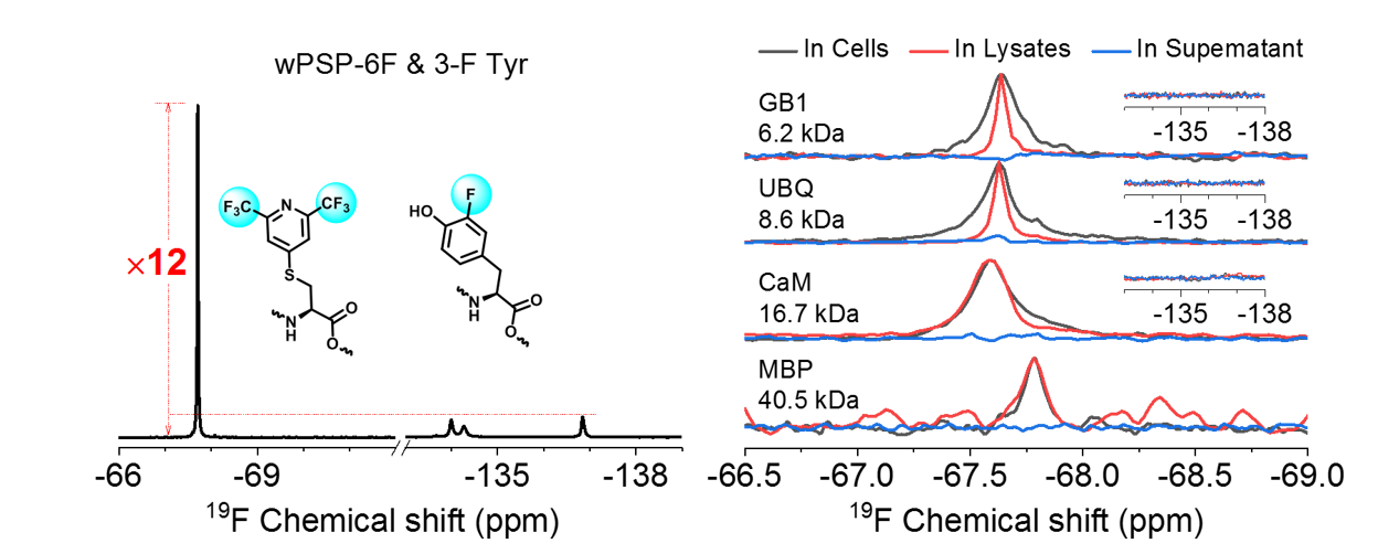 本工作中开展的高灵敏探针wPSP-6F可以在温和的条件下,高效地连接到蛋白质半胱氨酸残基上,形成的碳硫键在细胞内非常稳定。与常规的3-氟酪氨酸标记相比,新探针的灵敏度提高10倍以上(wPSP-6F探针标记的GB1在30 min左右即可观测到信噪比较高的核磁信号,但是相同时间内3-氟酪氨酸和15N标记的GB1则无信号)。