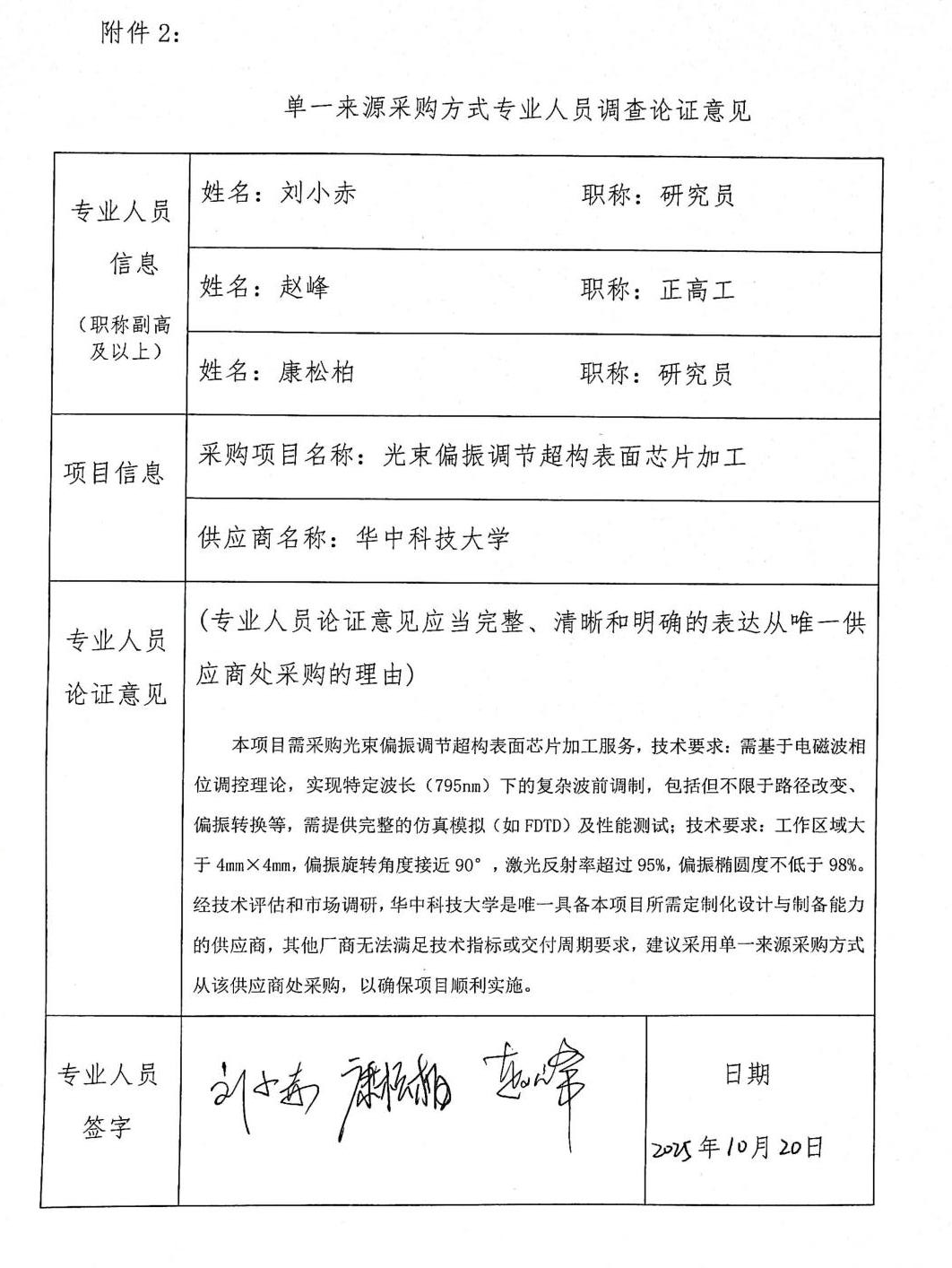 需采购光束偏振调节超构表面芯片加工服务,技术要求:需基于电磁波相位调控理论,实现特定波长(795nm)下的复杂波前调制,包括但不限于路径改变、偏振转换等,需给予完整的仿真模拟(如 FDTD)及性能测试;技术要求:工作区域大于 4mm×4mm,偏振旋转角度接近 90°,激光反射率超过 95%,偏振椭圆度不低于 98%。经技术评估和市场调研,华中科技大学是唯一具备本项目所需定制化设计与制备能力的供应商,其他厂商无法满足技术指标或交付周期要求,建议采用单一来源采购方式从该供应商处采购,以确保项目顺利实施。